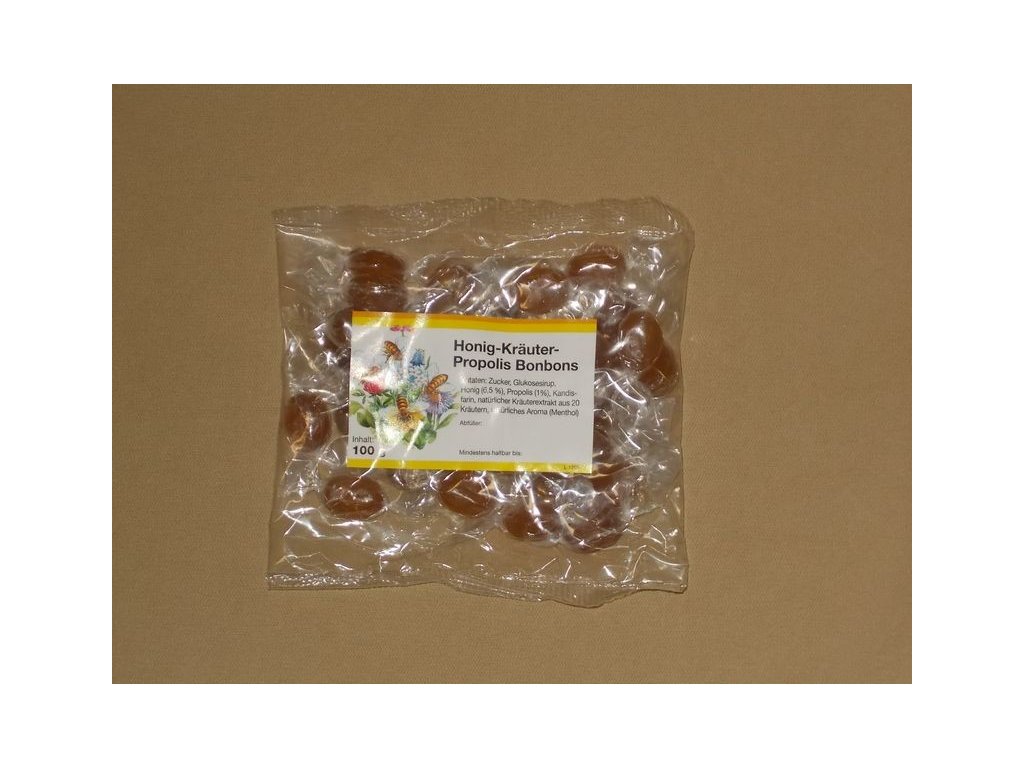 Složení: cukr, glukózový sirup, med(6,5%),propolis(1%),extrakt z 20 bylin, mentol