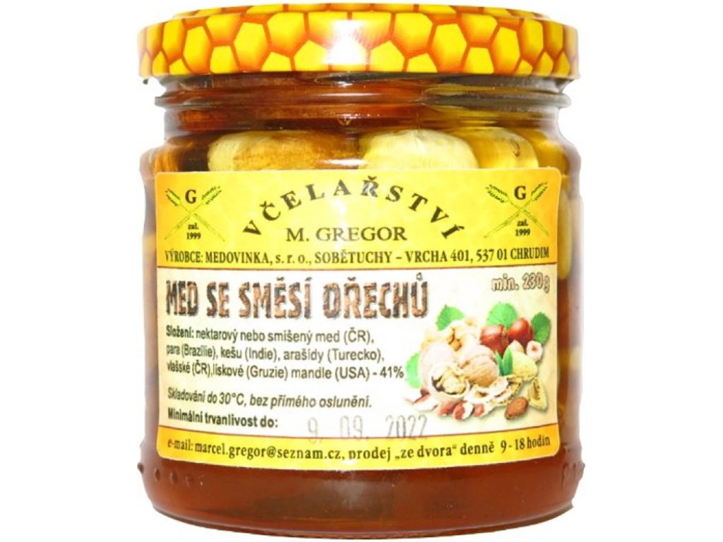 Nektarový nebo smíšený med z České republiky, para ořechy (Brazílie), kešu (Indie), vlašské ořechy (ČR), arašídy (Turecko), lískové ořechy (Gruzie) a mandle (USA) - 41 %.