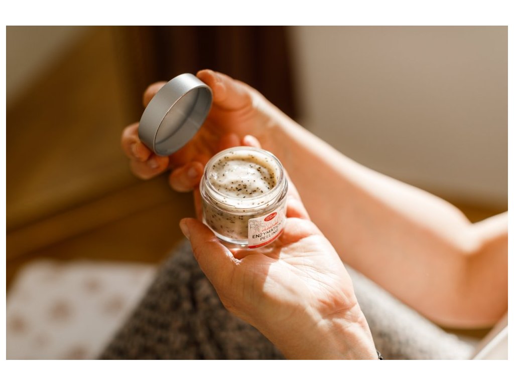 Přírodní Enzymatický peeling je založen na gelotvorných látkách rostlinného původu – xanthanu, pullulanu a lecithinu, který má částečné emulgační schopnosti. Jeho zásadní účinnou látkou je Superox C. Pochází z extraktu z kakadu švestek, které jsou známé jako největší přírodní zdroj vitaminu C.